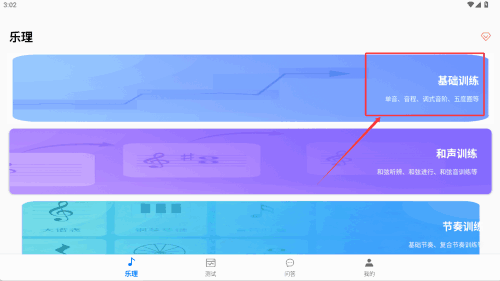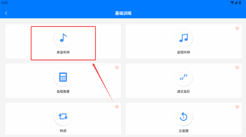 3、在乐理主页选择基础训练板块,点击单音听辨练习。