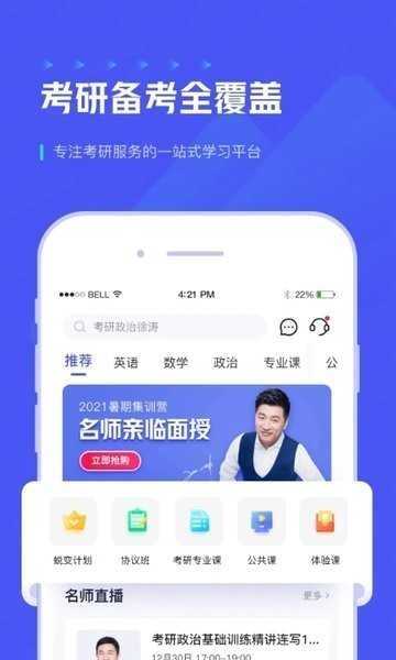2、包括免费试听课程、知名教师直播课程和1v1定制课程,提供多样化的学习选择,帮助考生系统学习考研知识,攻克重点和难点。
