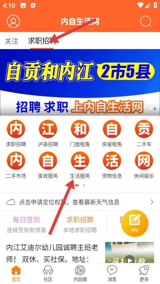 1、求职招聘频道覆盖自贡和内江2市5县,除招聘求职外,还整合门面租售、二手车等生活服务板块,提(ti)供每日签(qian)到等互動功能,构建本(ben)地(di)生活服务。