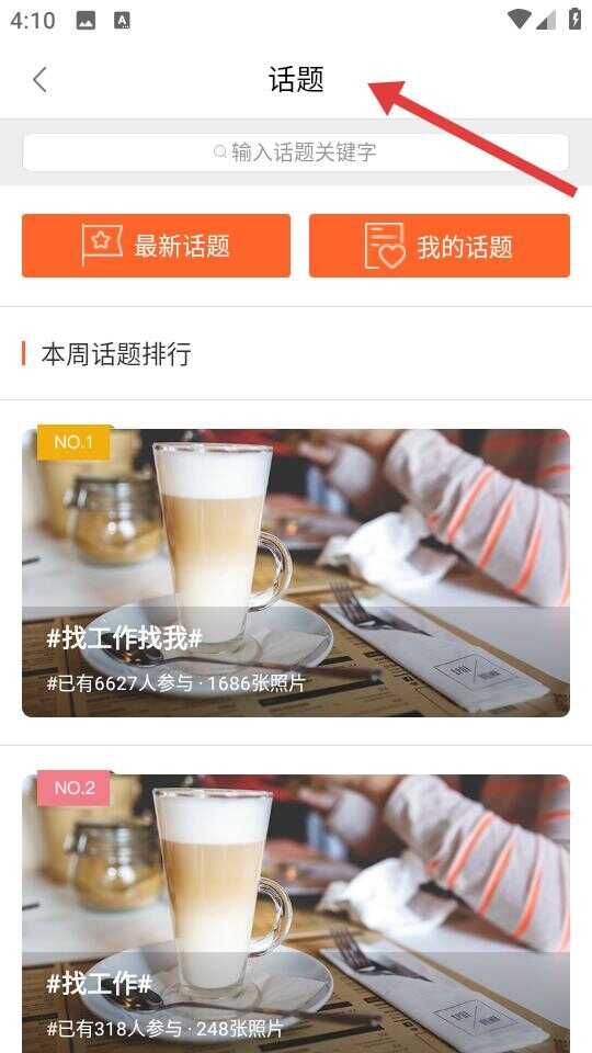 2、话题页面设最新话题与我的(de)话题入口,本周排行聚焦找工(gong)作(zuo)找我等求职相关话题,参与人数超六千,照(zhao)片(pian)近两千张,为求职者与招聘方提(ti)供互動交流场景。