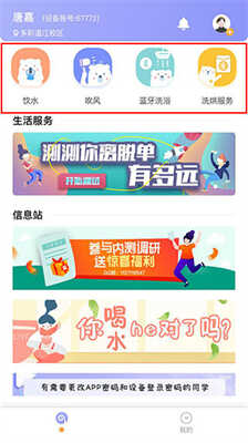 3、进入主页之后,就能看到饮水、吹风、洗烘服务等功能区,轻松使用。