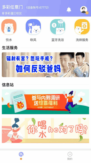 多彩校园中拥有(have)多项生活服务,如失物招领、校园导航、成绩查询等,轻松解决生活中的各种问题,智能推荐系统,为在校学生提供自助饮水,洗衣,淋浴吹风等一系列服务,自(zi)由(you)选(xuan)择(ze)设备并在线支付,提(ti)高校园生活的便利性。