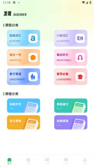 1、在首頁中提供了四级词汇、六级词汇、每日一句、每日听力、亲子英语、留学必备以及课程分类信息;