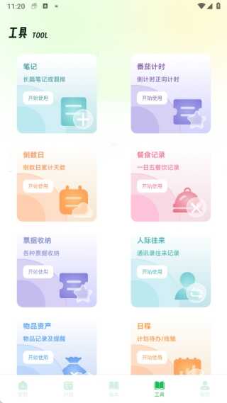 4、在工具页面中有笔记、番茄计划、倒数日、餐食记录、票据收纳、人际往来、物品资产和日程等糼能。