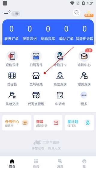 2、点击主页的“菜鸟驿站”