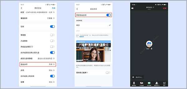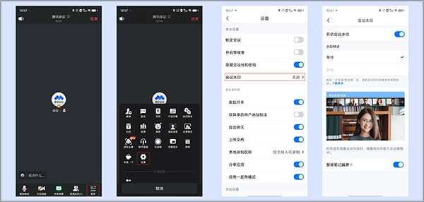 ②会议中点击【更加多】->【设置】->在设置页中点击开启【会议水印】->进入“会议水印”页面->勾选【开启会议水印】->选择【单排】/【多排】,预览后返回设置页,即达成会议水印设置。此时整个会议画面,即会展示水印。