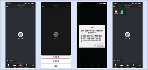①会中点击底部工具栏【共享屏幕】->选择【共享屏幕】->点击【立即开启】即可进入共享屏幕状态;