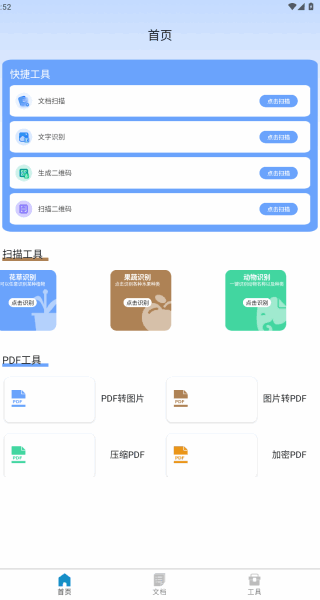 1、打开软件,进入到首页,你可以看到有快捷工具(tool)、扫描工具(tool)、PDF工具(tool)。