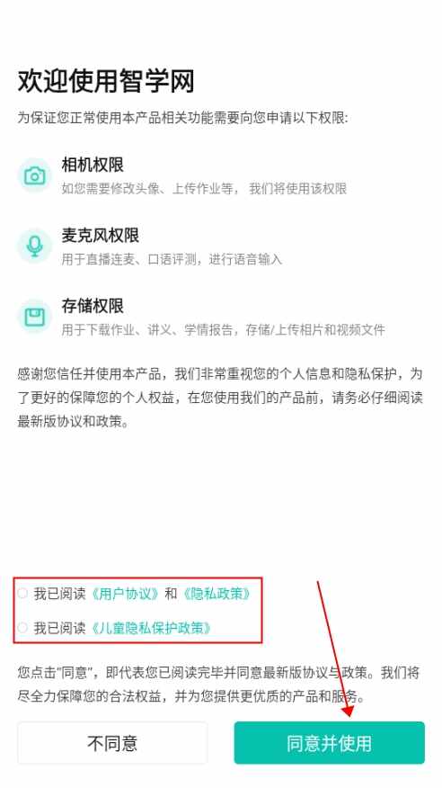 1、渞姺,进入掱僟上的智学网APP,然后,点击下方的【同意并使用】。