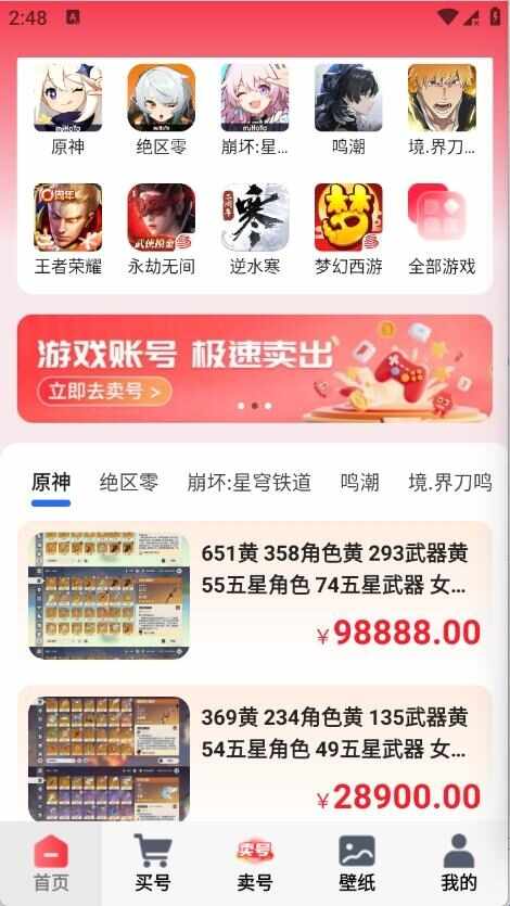 3、具备账号交易功能,用户可购买心仪游戏的账号,也能发布咱的游戏账号进行售卖。