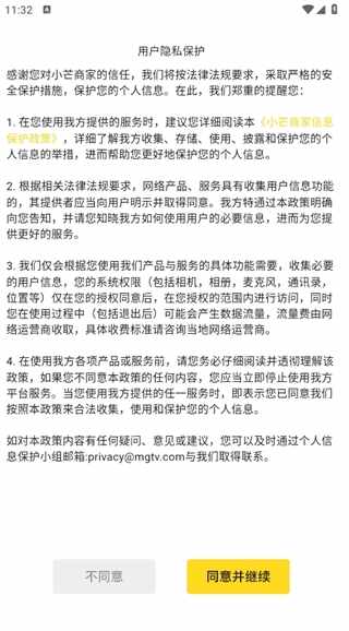 1、下载小芒商家版最新版安装包,打开它你会看到(See)用户隐私保护弹窗,点击同意并继续。