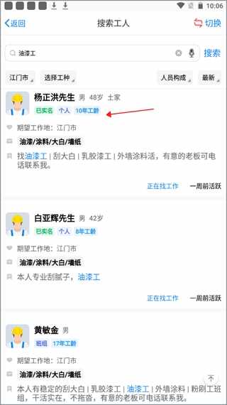 3、输入好需求后就可以(jiukeyi)前进筛选,选择自己(oneself)需要的工人,点击工人的個人主页