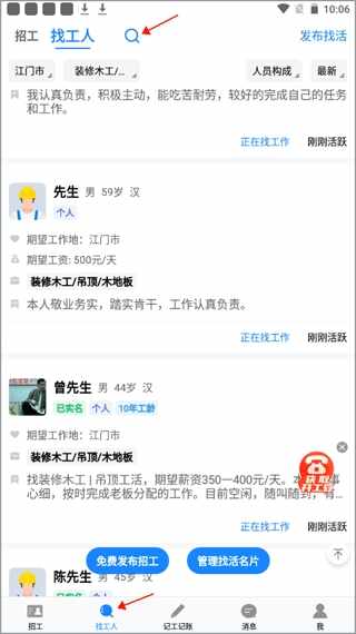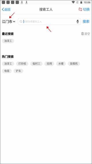 1、下载后打开(Open)app,切换(huan)到“找工人”界面(mian),点击上方的搜索框