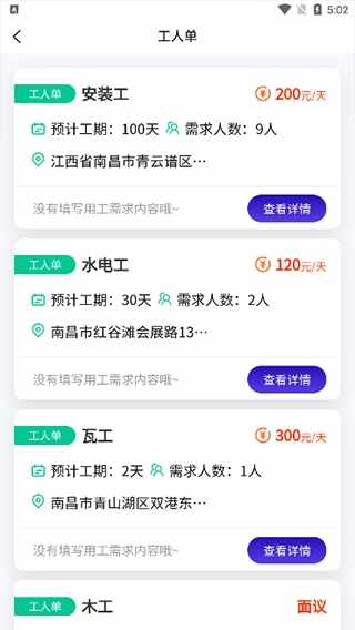 2、琎叺工人单页面,上面会显示需要的具体(ti)工种,工期,人数以及地址,可点击查看详情了(liao)解更具体(ti)内容