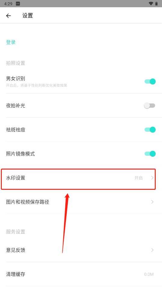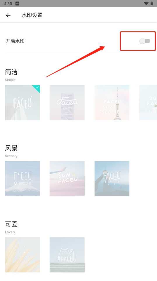5、点击图示位置关闭即可,这样拍摄的照片就不会有Faceu激萌的水印了