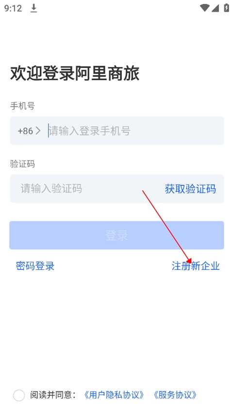 1、打开阿里商旅APP,确认提示,点击【注册新企业】