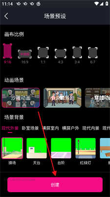 2、自定义画布比例、动画场景、场景背景之后点击【创建】。