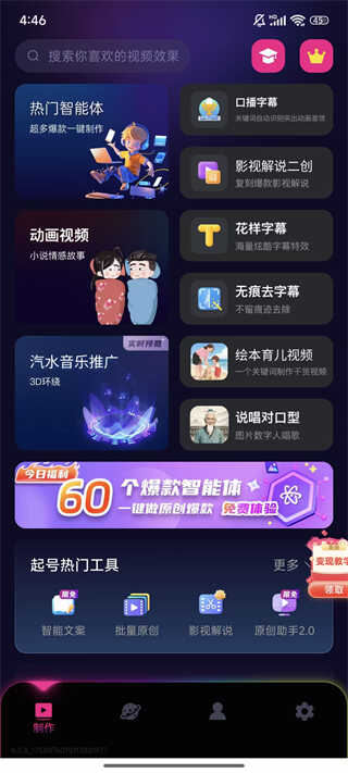 1、进入软件首页,可以(keyi)在这里找(zhao)到(dao)软件提供的剪辑以及視頻创作等一系列功能。