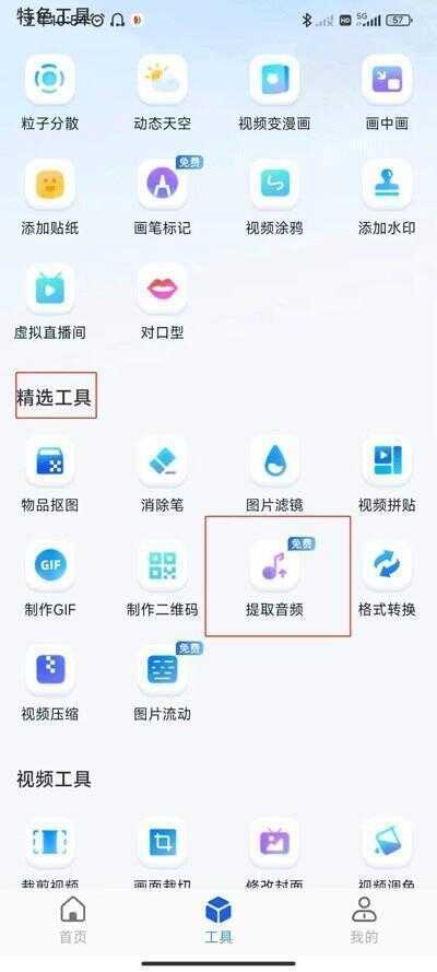 2、在精选工具中选点击提取音频的选项。