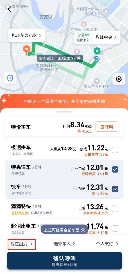 2、滴滴快车、拼车、优享,平台以快速响应、实惠价格,为乘客提(ti)供(gong)更高效的服务。