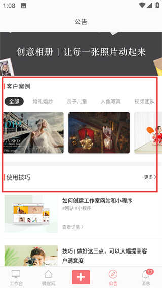 4、在公告页面可以查看其他优秀摄影师的案例分享,以及软件的使用技巧等等。