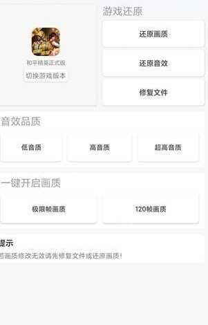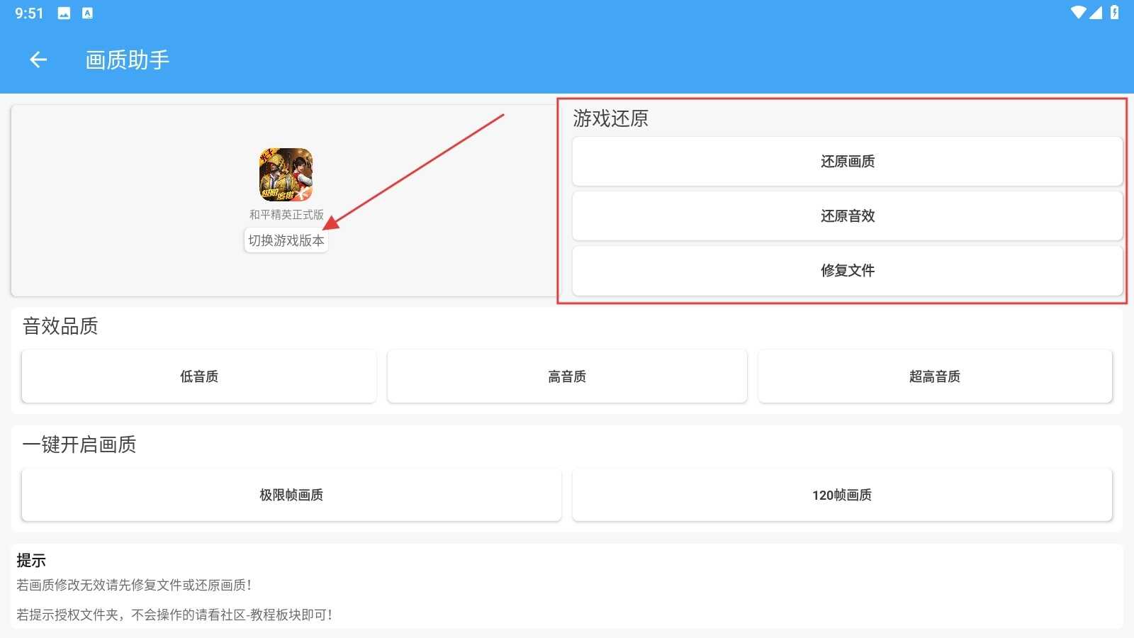 2、在【画质助手】页面,可点击【切换游戏版本】切换游戏版本,还能按需选择【还原画质】【还原音效】【修复文件】等操作。