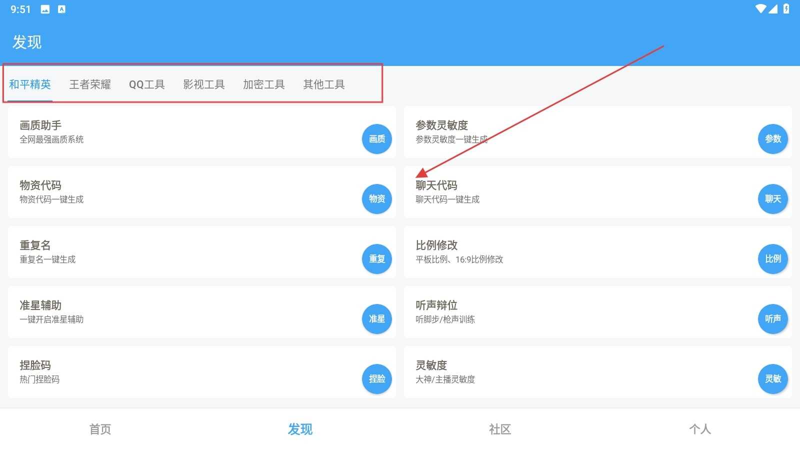 3、在【发现】页面,可按需求选择【和平精英】【王者荣耀】等分类,点击如【聊天代码】等工具使用相应功能。