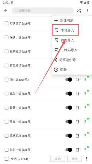 3、点击“本地导入”功能,准备将本地书源文件导入到应用程序中。