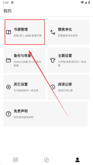 2、选择“书源管理”选项,以便进行书源的相关操作和设置。
