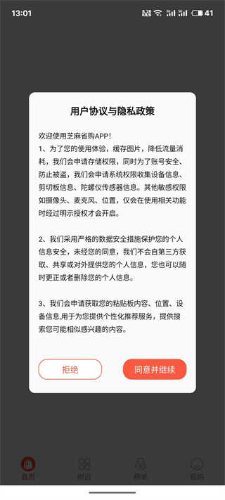 1、下载最新版本软件,首次启动时请閱讀并同意隐私权限协议。