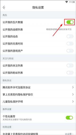 3、进入后把“公开我的瓦片数据(shuju)”关闭,这样别人就看不到你的战绩了。