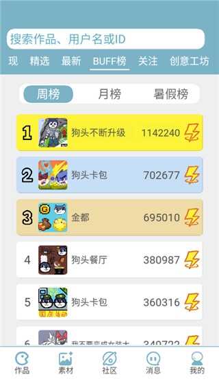 4、游戏中还有多种(zhong)热门(remen)榜单,如周榜、月榜、暑假榜,你可以看看他人制作的创造的优(you)秀游戏。