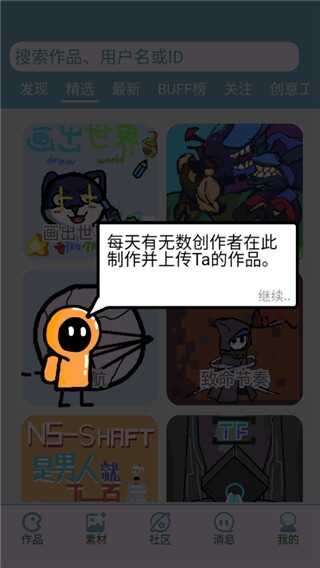 5、如果你也想自己创造游戏,首先(xian)需要在素材功能中,挑选(xuan)自己所需的材料。