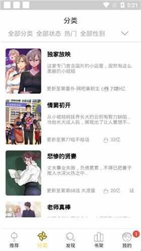 3、分类详尽:根据漫画类型、地区、风格等进(jin)行(xing)了细致分类,便于用户快速找(zhao)到(dao)感兴趣的漫画。