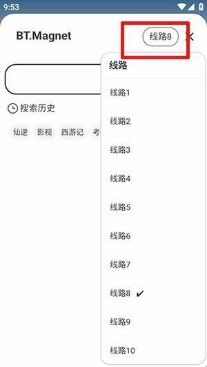 3、点(dian)击右上角的线路选项可以更换搜索线路。