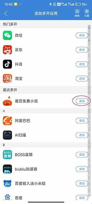2、在想要多开的应用(application)的右侧点击“添加”。