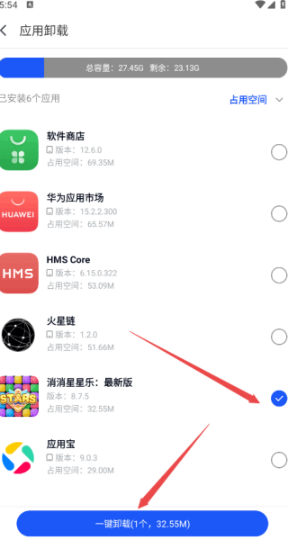 3、会自动识(shi)别(bie)手机鮟裝的所有应用,大家可以勾选需要卸载的应用;