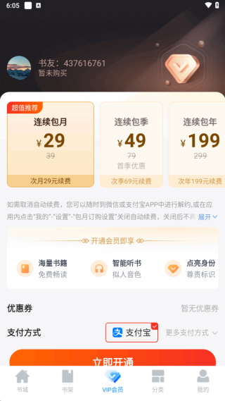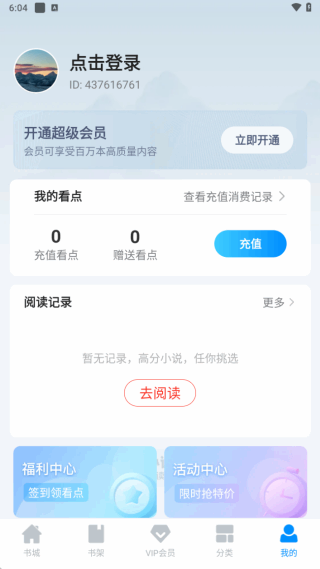 3、进入底部的会员(yuan)板块,鼡戶可以开通会员(yuan),解锁更多VIP小说章节。