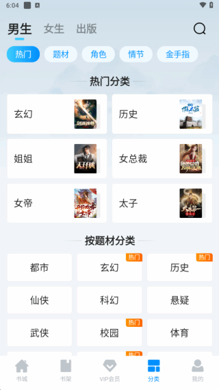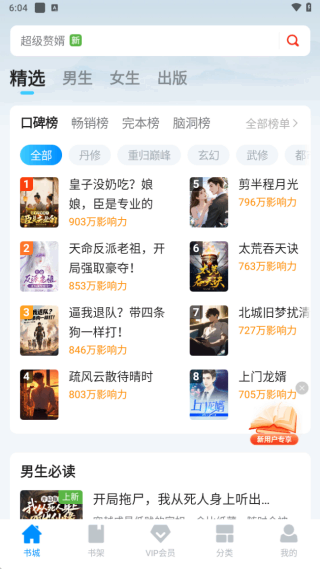 1、打开软件,进入首页,涵盖(hangai)了精选、男频、女频、出版等分类小说。