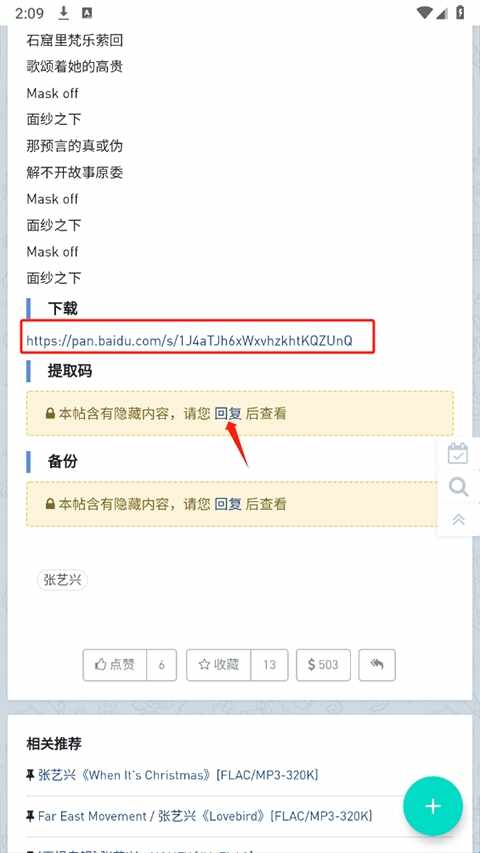 4、进入后将页面下拉到底部,可以看到歌曲的网盘下载链接,提取码会隐藏,需要在评论区回复内容才会显示,点击回复按钮