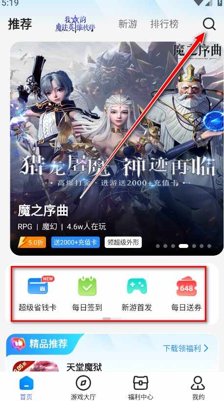 1.提供精选、折扣、高福利、新游榜等导航板块,快速定位目标游戏。