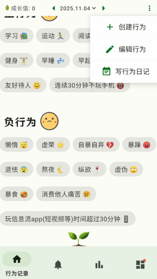 4、提供行为记录功(gong)能,记录自己的各种(various)正向行为和负向行为,如完成一项工作、吃了一份健康(kang)餐等。