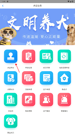 2、选择怼應城市后点击犬证申办,阅读(read)当地养犬政策与办理条件。