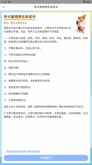 3、在线签署电子版养犬责任承诺书,进入犬只信息登记界面。