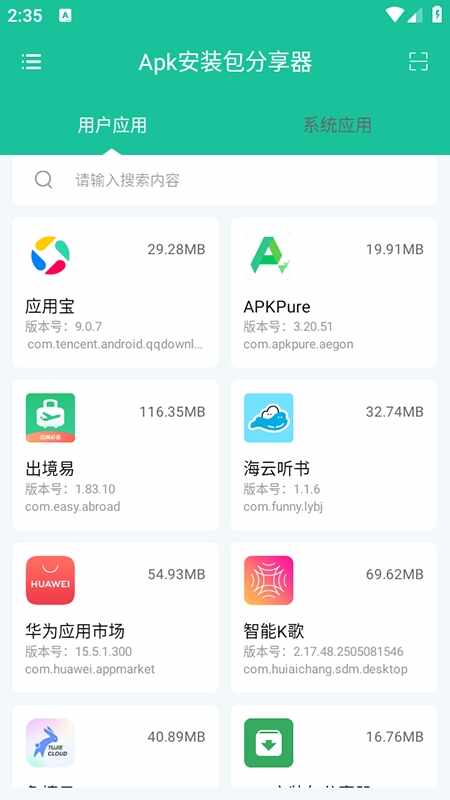 用户能够浏览系统应用或個亾应用,快速确定安装包文件所在位置,并发起APK文件的传输共享(gongxiang)。