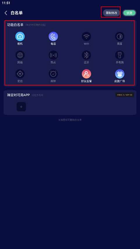 3、如果想要添加的应(ying)用不在列表上,可以点击限制修改,不过此功能需要开通会员,会员特(te)权如下。