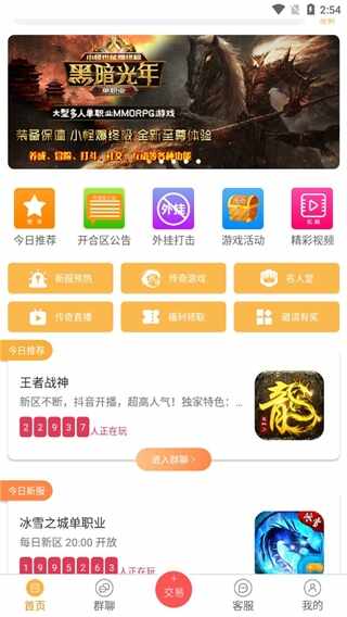 2、进入软件“首页”即可看到:今日推荐、开合区公告、外挂打击、游戏活动还有十分精彩视频。