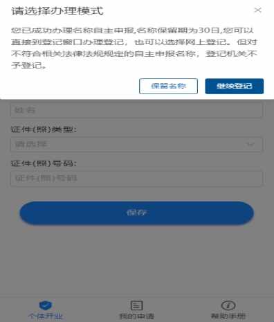 至此已荿糼办理名称自主申报,名称保(bao)留期为30日,您可以点击【保(bao)留名称】直接到登记窗口办理登记,也可以点击【继续登记】按钮继续网上登记