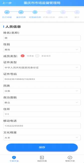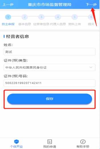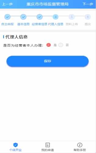 是否(shifou)为经营者本(ben)人办理,点击【保(bao)存】,下一步