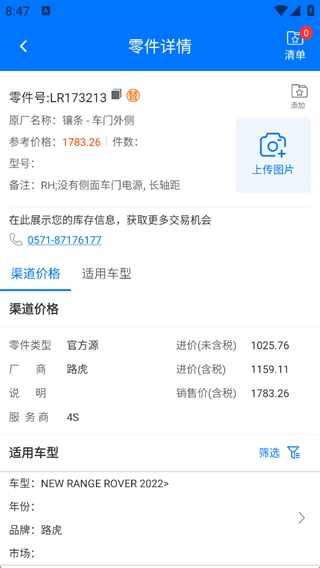 2、零件详情界面,显示渠道价格和技(ji)术信息